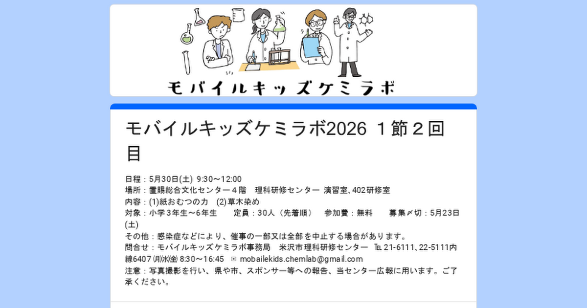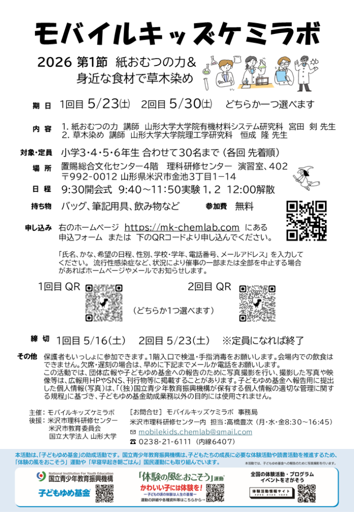 ●紙おむつの力 講師:山形大学大学院有機材料システム研究科 宮田 剣 先生 ●身近な食材で草木染め 講師:山形大学大学院理工学研究科 恒成 隆 先生 詳細 日時:5月 30日㊏ 9:20~12:00 対象:小学校 3・4・5・6 年生 定員:30名(先着順) 場所:置賜総合文化センター4階 理科研修センター 演習室・402 研修室 参加費:無料 締切:5月 23日㊏ ※定員になり次第終了 持ち物:バッグ、筆記用具 申込方法:[Google Form] モバイルキッズケミラボ2026 1節2回目日程:5月30日(土) 9:30~12:00 場所:置賜総合文化センター4階 理科研修センター 演習室、402研修室内容:(1)紙おむつの力 (2)草木染め対象:小学 3年生~6年生 定員:30人(先着順) 参加費:無料 募集〆切:...![]()